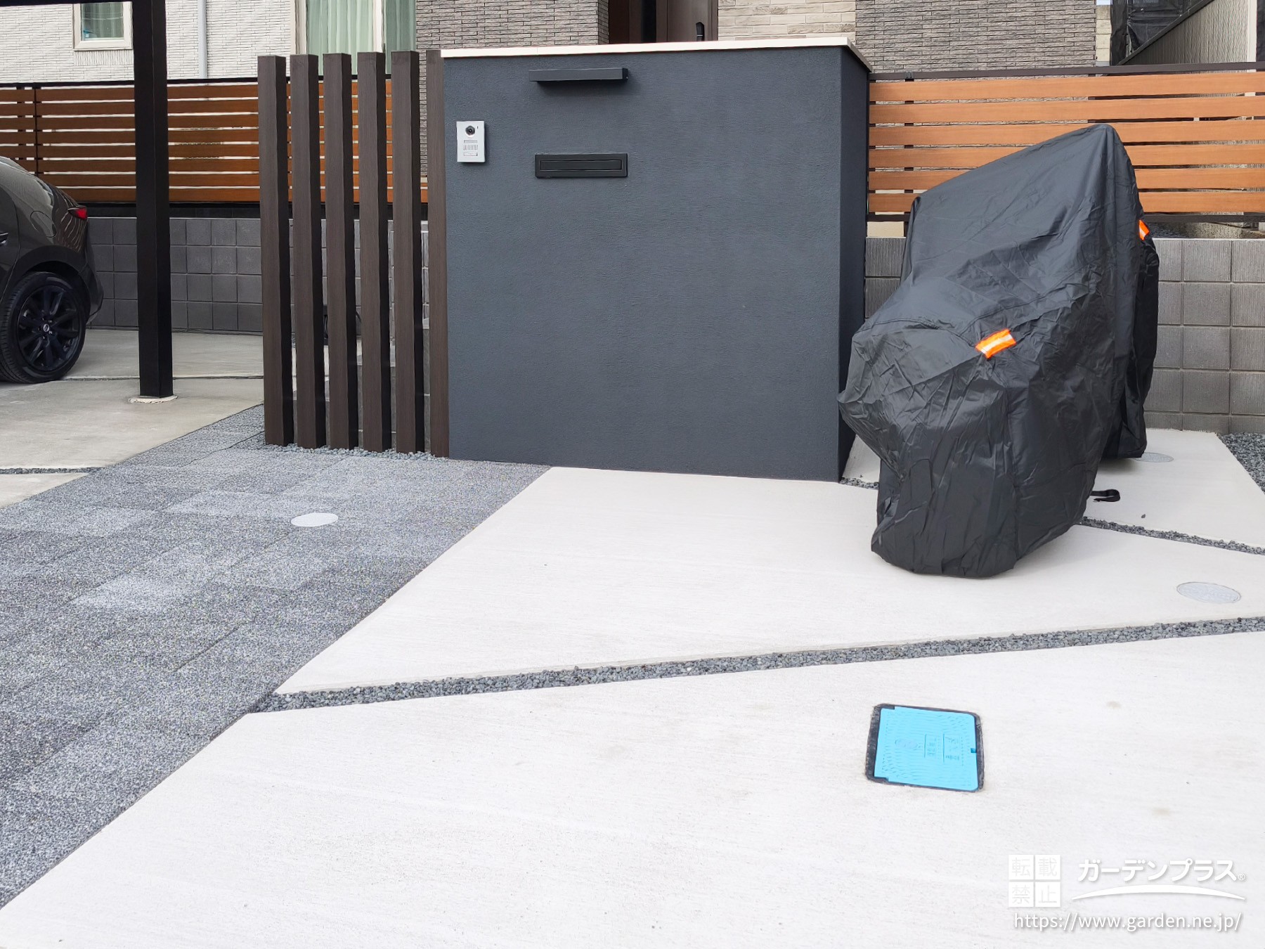 右側にはデザインスリット入りの土間コンクリートを施工し、駐輪スペースとして使いやすいフラットな仕上がりに。砂利を敷いたスリットは排水性が高く、見た目と機能の両方に優れています。目地はタマリュウやレンガ、人工芝などにもアレンジ可能です。