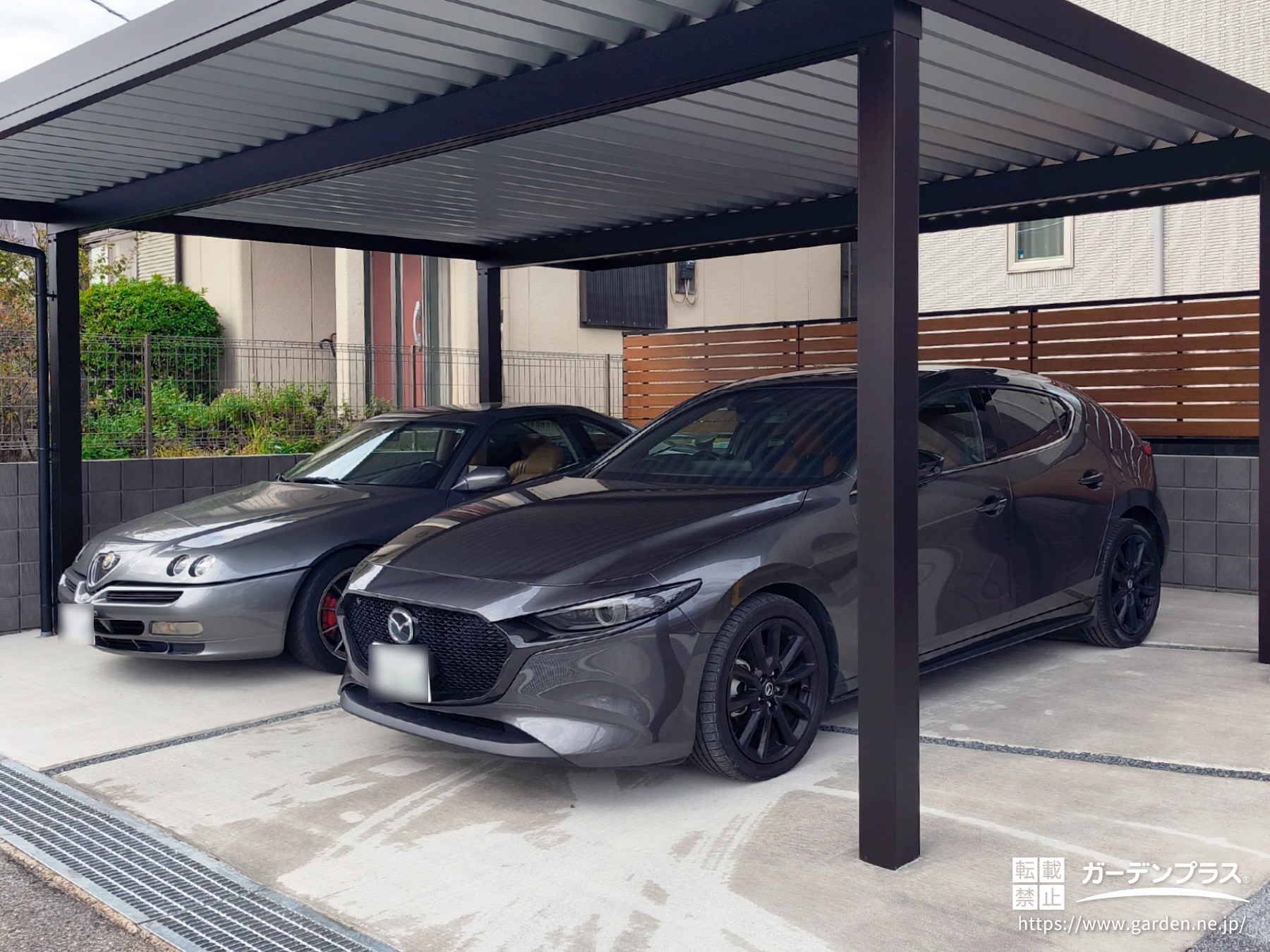 こちらは土間コンクリートを打設した駐車スペースです。頭上には、2台のお車をゆったりと並べて駐車できるカーポート、YKKAPの『ジーポートPro900タイプ 2台用』を設置しています!