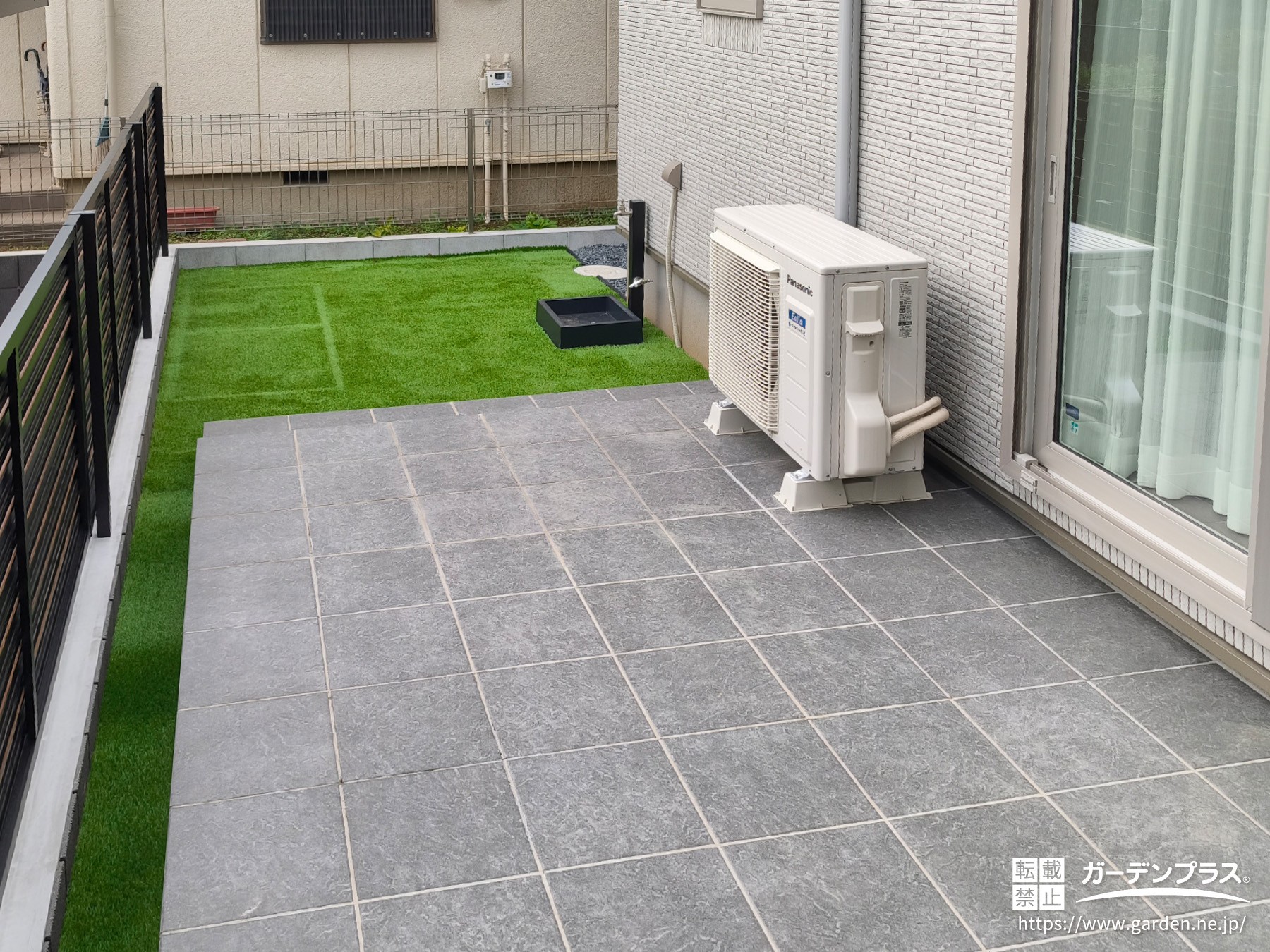 ハウスメーカー様が施工されたおしゃれなタイルデッキの周りに、人工芝を敷設しました!一年中いつ見ても鮮やかなグリーンが楽しめるので、お住まい全体の雰囲気が明るくなります。