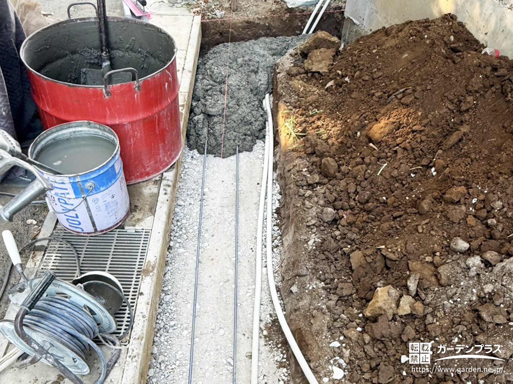 造作門柱をしっかりと支えるために基礎施工を行っています(^^)/今回は門柱のサイズが大きく、重量も出るため基礎部分は特に重要な工程です!!既存部分との接合部には鉄筋アンカーを施工し、新設する門柱とのつながりを強化しながら、ひび割れやはがれを防ぐための下地づくりを行います(^^♪