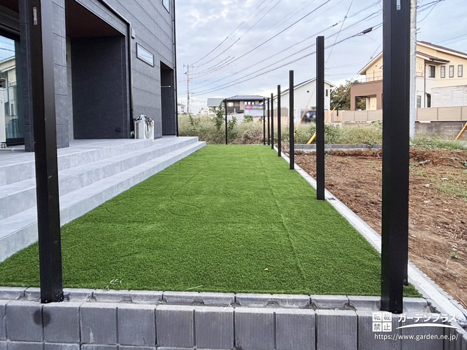 人工芝を敷いたことで、お庭全体に明るくやわらかな印象が加わり、新築外構らしいすっきりとした綺麗な仕上がりになりました(´艸`*)冬も青々としたグリーンが楽しめて、お手入れの負担を軽減できるのが魅力です♬
