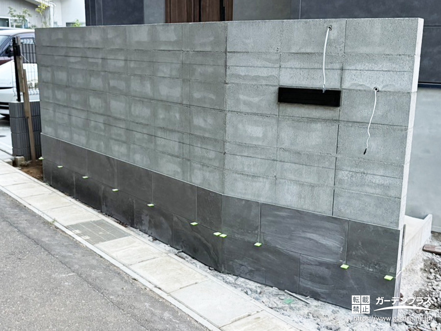 ブロックの下地が完成した後は、埋込タイプのポストやインターホンの設置位置を確認しながら、必要な開口部を確保し仕上がりをイメージしながら調整を行います☆その後、門柱の表面を整えて、タイルを貼るための下地を作り、写真のように下からタイルを一枚ずつ丁寧に貼って仕上げていきます٩( ‘ω’ )و