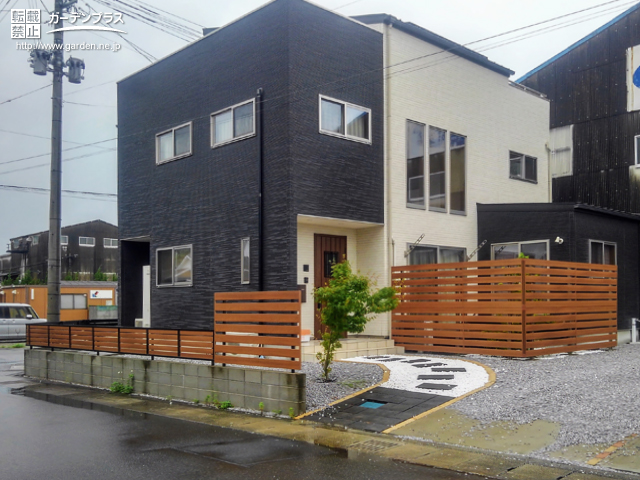 そしてこちらが施工後のタイルです。お住まいの外壁がダークグレーのボーダーデザインでしたので、フェンスの基礎にもボーダータイルを使いました。