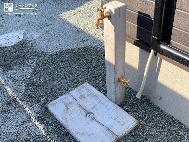 使ったのは門柱の擬木と同じ東洋工業社の、ヴィンテージウッドポール+ゴールドカラーのウォータービュータップです。白塗りの木材のように見えますが、こちらもコンクリート製。水回りに天然木を使うと腐食が進みやすくなりますが、コンクリート製なら経年劣化も気になりません。白い古木風の水栓柱とゴールドの蛇口がおしゃれですね。