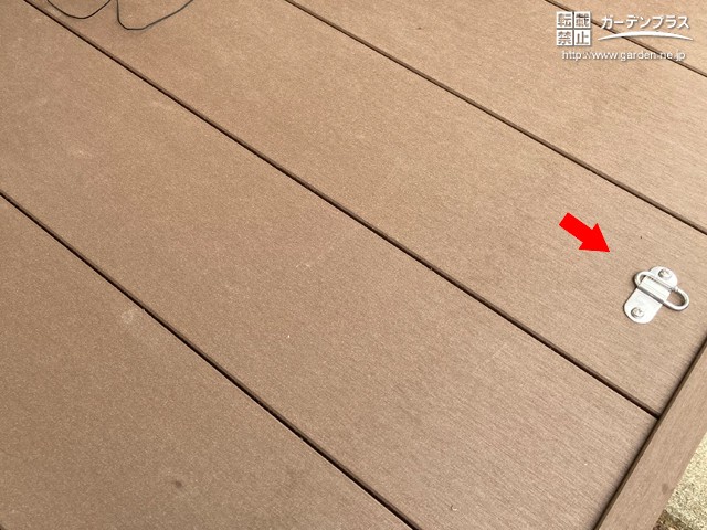 デッキにつけた金具はこんな感じです。使わないときはぺたんと畳まれていますので、お子様が遊ぶときもつまずく心配がありません。