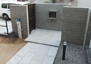 写真右側、門柱と3枚目の壁の間はスリットフェンスを設置しました。