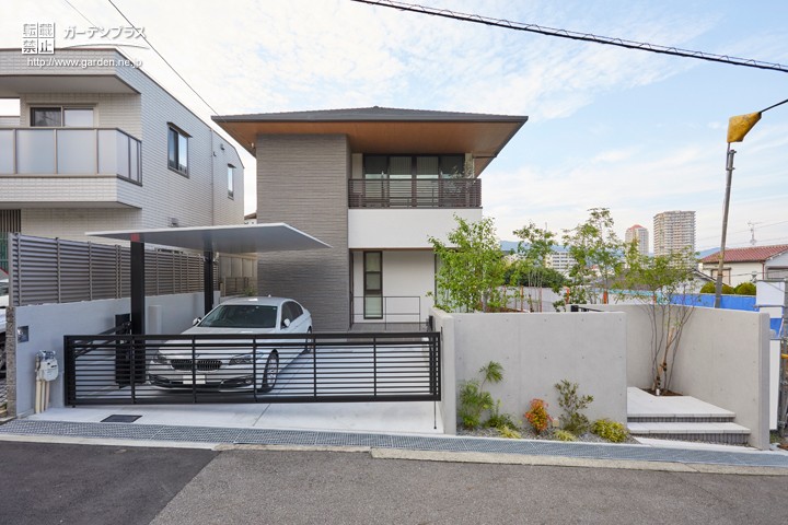 こちらが賞をいただいたお客様宅の全景です。スタイリッシュな外観にあわせて、直線的なデザインの外構デザインに仕上げました。カーポートにはLIXIL様の「カーポートSC」、カーゲートは電動の「ワイドオーバードア」を採用しています。
