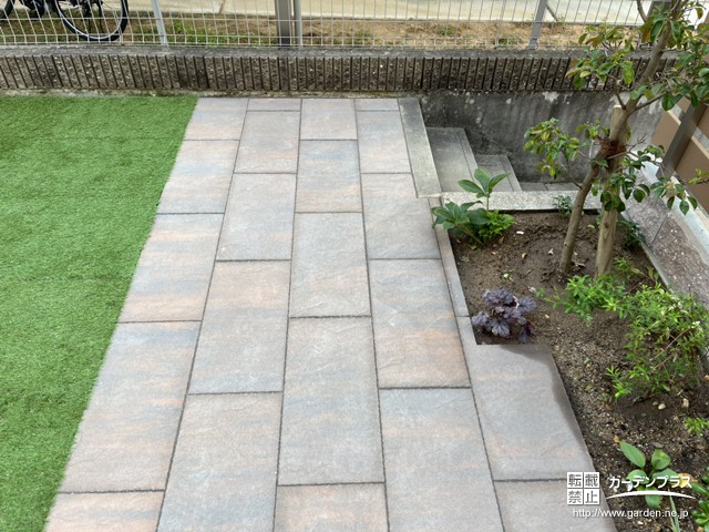 駐車スペースからお庭、そしてウッドデッキを繋ぐアプローチにはコンクリート平板を敷き詰めています。