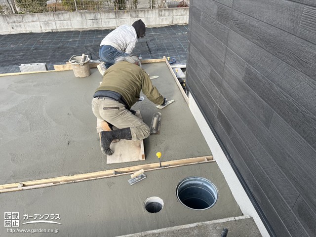こちらの写真は、職人さんがコテを使って表面を均している様子です。仕上げ方法としては「金ゴテ仕上げ」で施工しました。