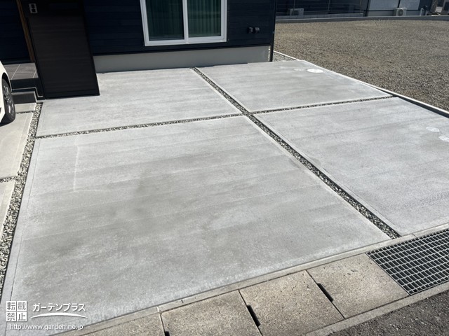 お車4台を停めることができる広々としたこちらの駐車スペースは、コンクリート舗装+砂利目地で仕上げました。目地を駐車の際のガイドラインにできるようにデザインしています。