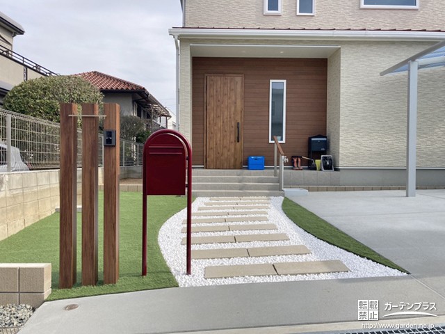 化粧砂利と組み合わせている飛び石にはコンクリート平板を使用し、やわらかなベージュのお色味がナチュラル感をアップさせてくれています。門柱としてアルミ製の木目調角柱にインターホンと表札を取り付け、その横には目を惹く鮮やかな赤色の独立ポストを設置しました。