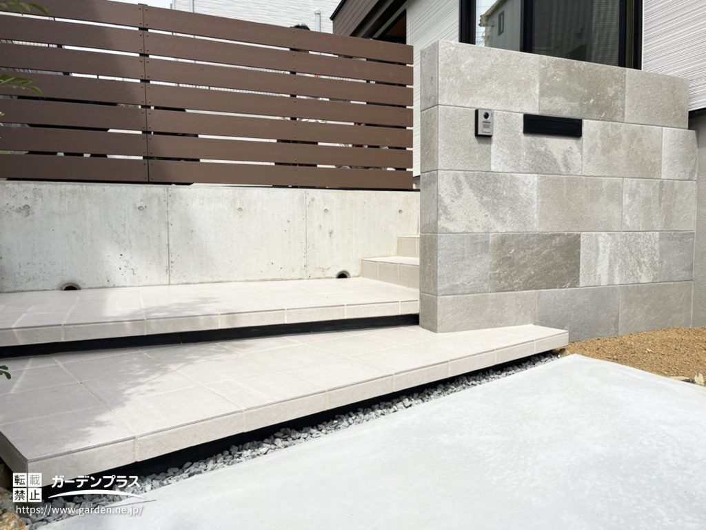 中でも、浮遊感のあるフローティングステップや質感豊かなタイルがアクセントに。シンプルなだけでなく、素材感や立体感を活かすことで、デザイン性と使いやすさを両立した外構が完成しました。