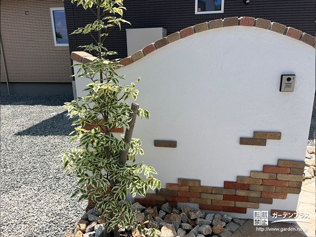 造作門柱の天端(てんば)を曲線加工しレンガを笠木として並べたおしゃれなデザインに。
