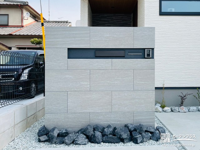 門柱の足元には、ゴロタ石をバランスよく配置。タイルの洗練された印象と自然石ならではの素朴な風合いが調和し落ち着いたナチュラルモダンな雰囲気を生み出しています。