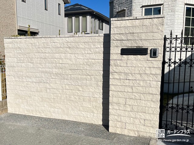 天然石が美しい、東洋工業の「レガンテウォール」を使用した造作門柱です。