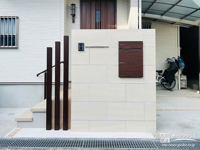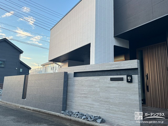 最後にご紹介するのは、大判タイルを贅沢に使った重ね塀が印象的な造作門柱です。異なる2種類のタイルを組み合わせ、間に塗装仕上げやフェンスを加えることで、重厚感の中にも抜け感を感じるデザインに仕上げました。存在感のあるファサードとして玄関まわりを彩りつつ、庭をおしゃれに目隠しする役割も果たす、一石二鳥の外構デザインです。