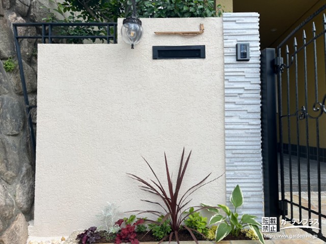 さらに植栽を加えることで、緑が引き立ち、バランスのとれたおしゃれな造作門柱デザインです。