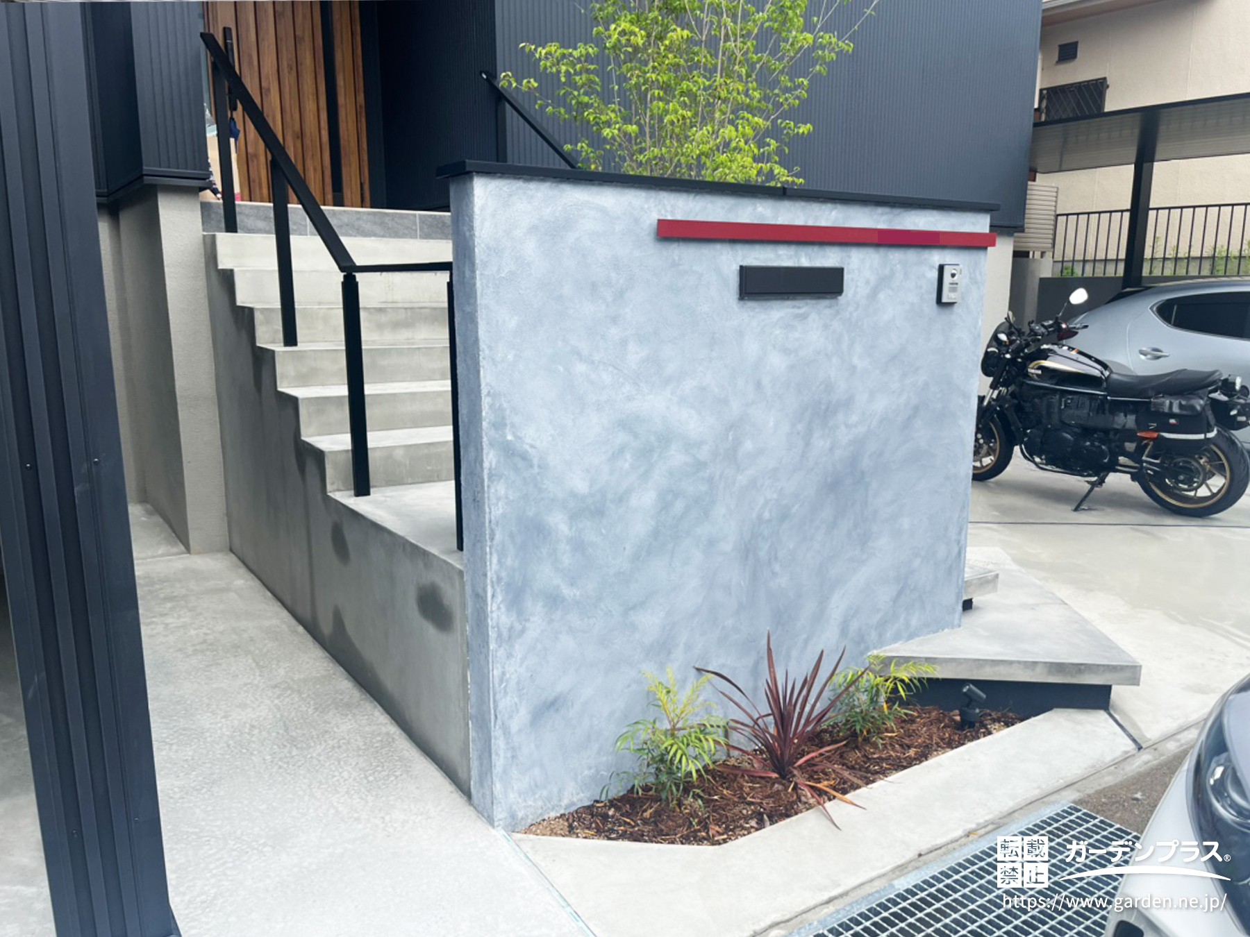 「赤×グレー」のアクセントカラーが映える門柱の外構事例をご紹介します。
