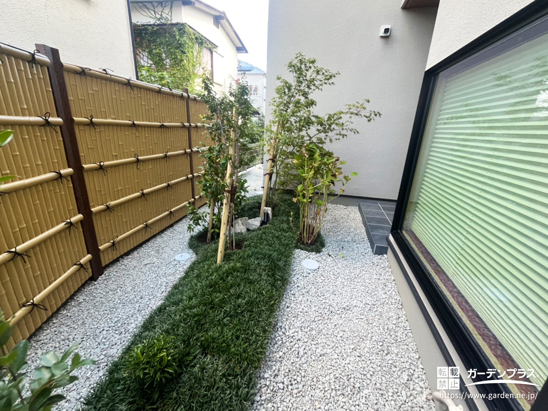 見どころの一つは、人工素材で竹の風合いを再現した竹垣フェンスです。和モダンの雰囲気を高めつつ、腐食しにくくお手入れも簡単にできます。
