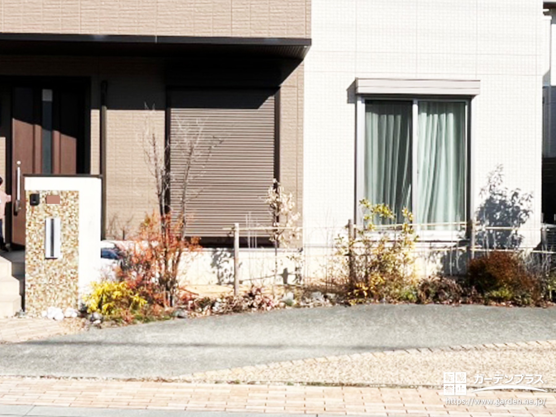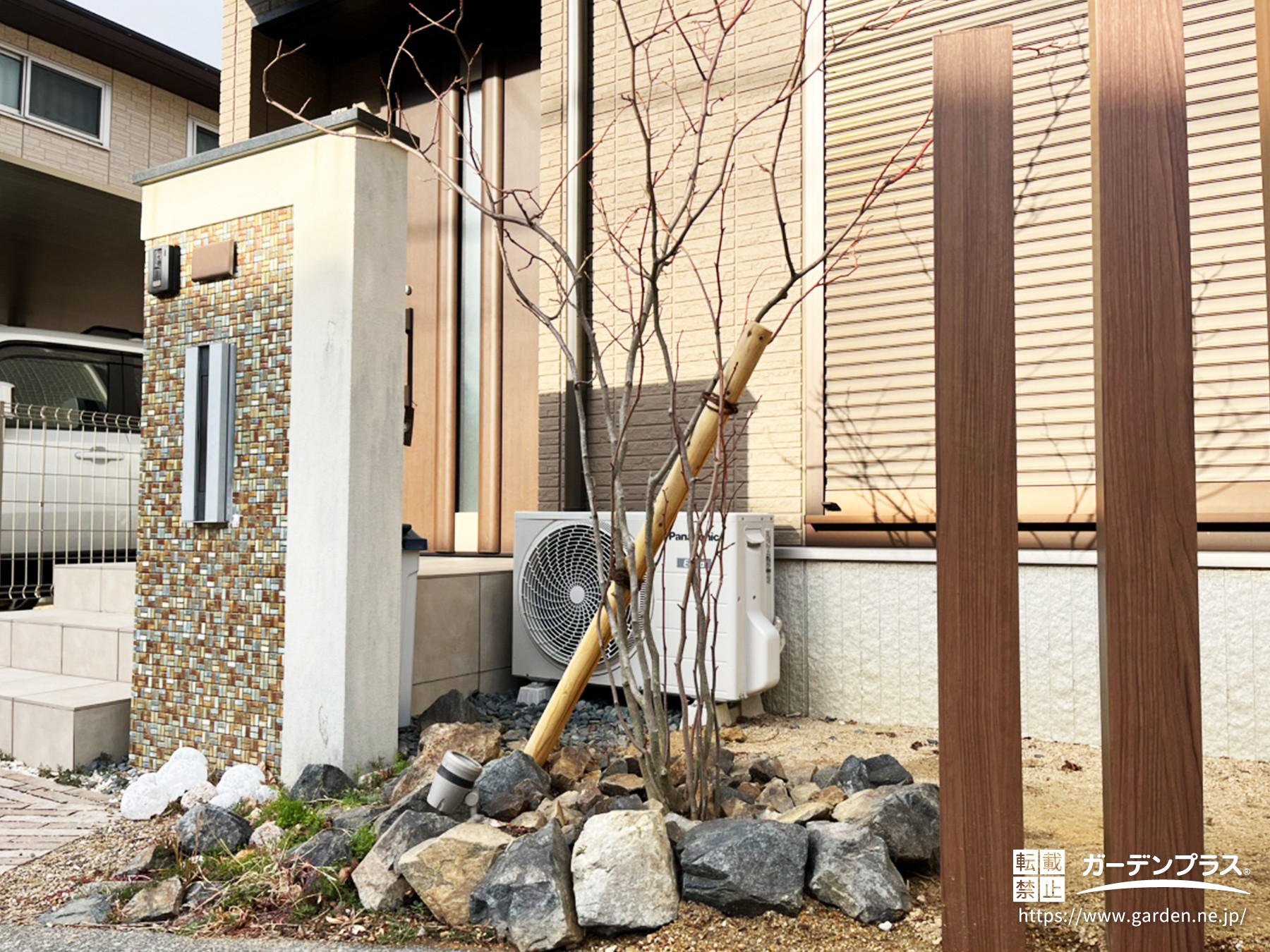 門柱と角柱の間には、新たなシンボルツリーとして「マルバノキ」を植えました。マルバノキ(丸葉の木)は、ハート型のかわいらしい葉と秋の紅葉が魅力の庭木。春には鮮やかな若葉、秋には赤く美しい紅葉で庭を彩り季節の移ろいを感じられるため、シンボルツリーとしてとても人気があります。