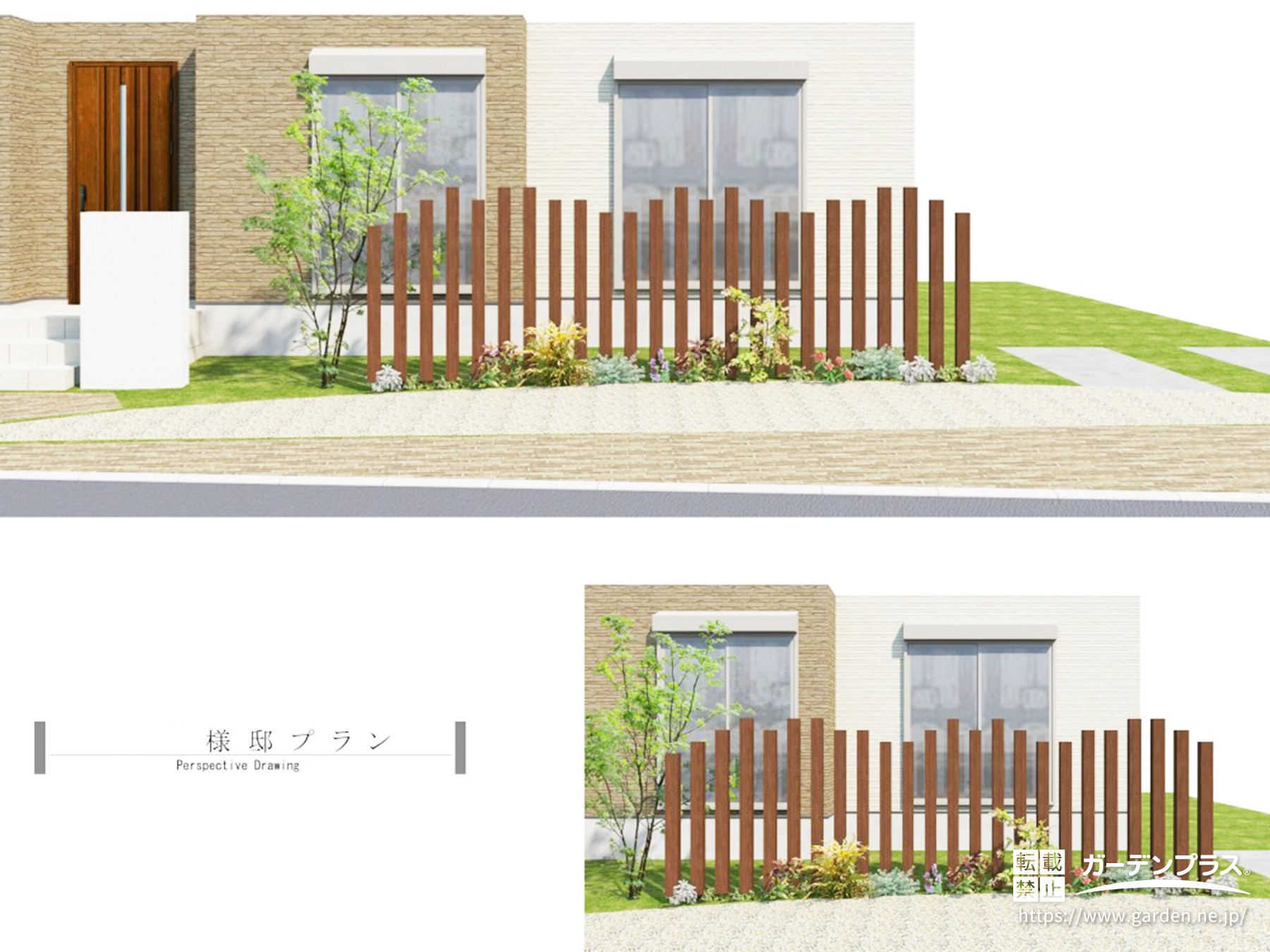 今回は角柱の後ろ側は土の状態のためお見積りには含まれていませんが、パースでは芝生や追加の植栽を配置したイメージを作成しました。視覚的に比較することで、より納得感のあるプラン選びをお手伝いいたします!
