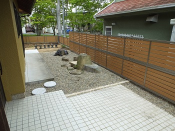 目隠しフェンスでプライバシーを確保し、雑草対策に砂利を敷かせて頂きました。また和風のイメージを崩さず、木目調のフェンスを設置させて頂きました。高さは約1.6mあり男性の目線よりも高いため、お庭に立っても十分な目隠しの高さとなります。