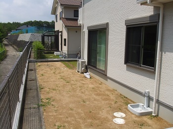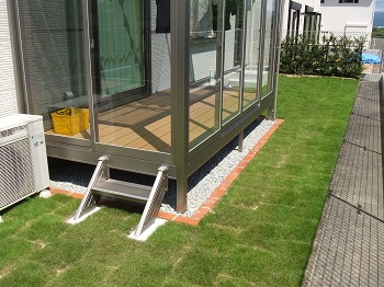 そこで物干し用にサンルームを設置して土の所は芝生を貼りました。