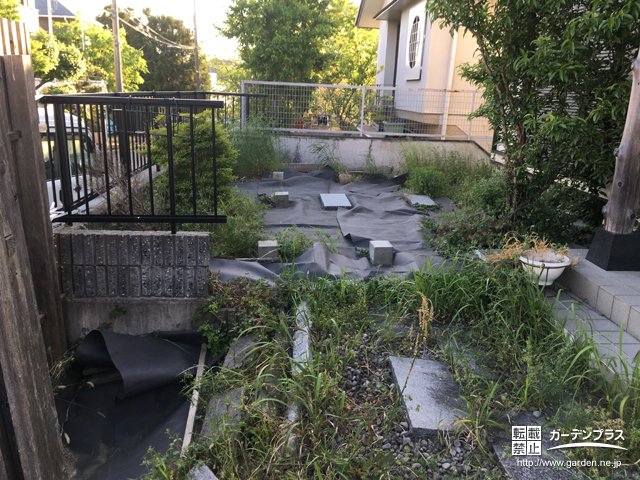 雑草を一部撤去し、整地をしてから防草シートを敷き直しました。これから人工芝や化粧砂利などを敷設して、お好みのお庭に仕上げていただけます。