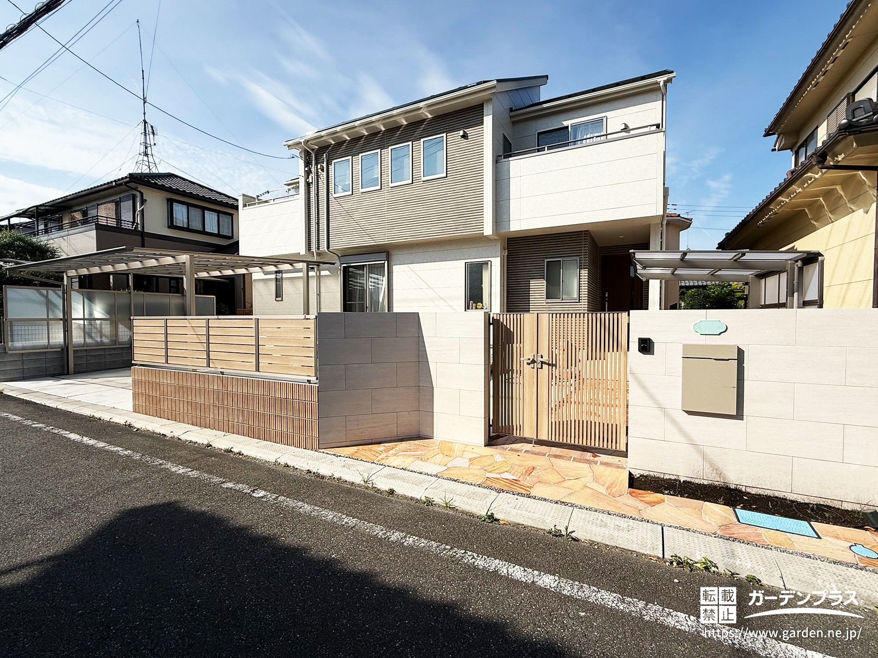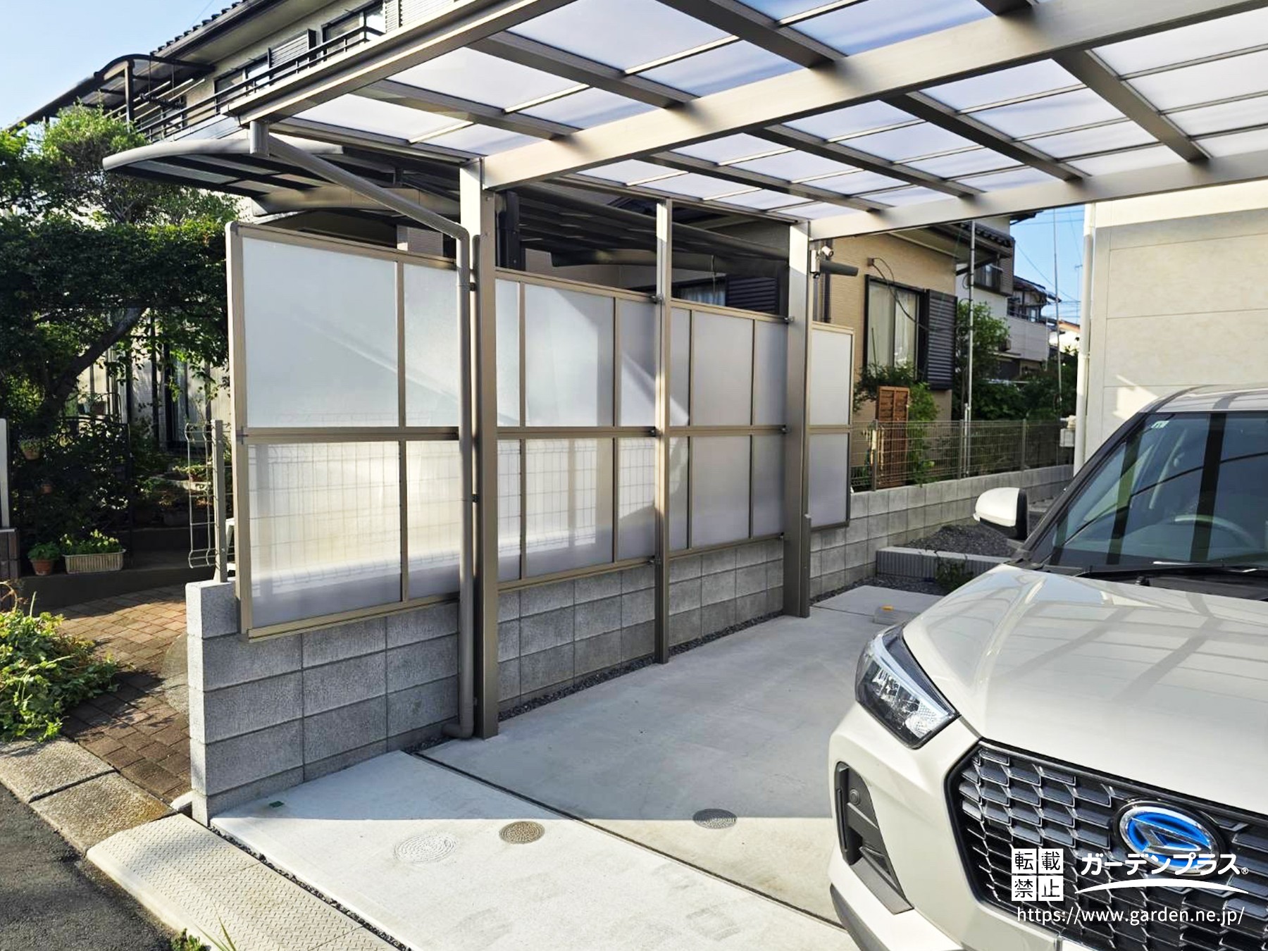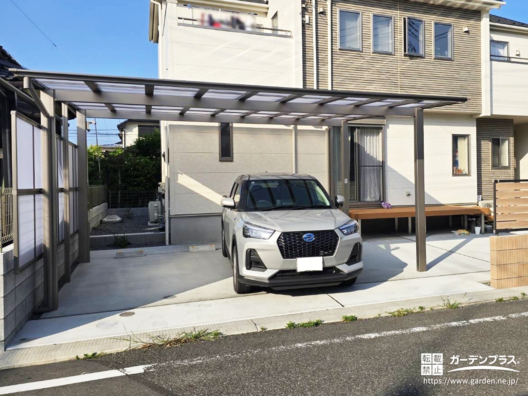 お客様は隣地境界側にも目隠しフェンスをご希望されていたので、カーポートにサイドパネルを付けることで、目隠しとすることを提案し、採用いただきました。カーポートはお家と相性の良い色合いの柱を選び、お家になじむ上品な見え方になりました。