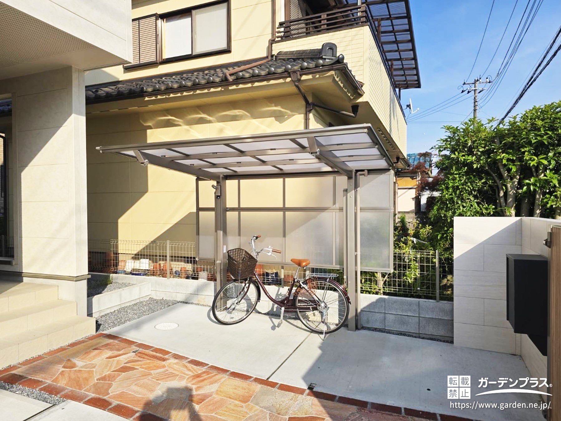 また、玄関周りのスペースに設置したサイクルポートは、LIXILの「ネスカFミニ」。ひとつ前の門まわりの写真でもサイクルポートが写っているのですが、セミクローズ外構により自転車が正面から見えなくなることで生活感を感じにくいおしゃれな見た目になるように設計しています。内側から見ると写真のような見た目です。余裕をもって自転車を停めることができ、カーポート同様サイドパネルを付けることで目隠しも兼ねております。