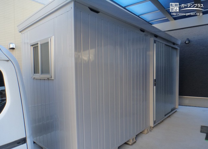 物置のサイズは、現地に合わせて最大の製品をご提案し、お施主様が御商売をされておられる関係で、資材搬入に便利な棚や窓ガラスや網戸の設置をオプションで加えました。物置の高さは、基礎ブロックの高さを調整して、カーポートの屋根に支障が出ないよう工夫しました。
