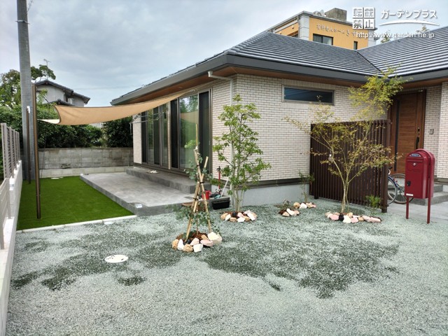 目隠しを兼用する形として、植栽をレイアウトして組み合わせることで、より一層デザイン性が高まります。植栽として、ソヨゴ(常緑性高木 H2.0株立)イロハモミジ(落葉性高木 H2.0株立)ユーカリ ポポラス(常緑性高木 H1.5)低木類は3本程度、根占として配置しました。やはり緑のある敷地は、人や環境にもやさしさが感じられる素敵な空間になります。