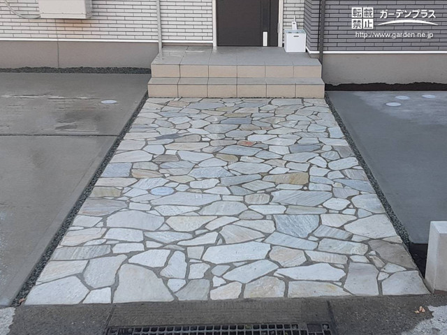 ファサードと駐車スペースとお庭に分けるのが中央のアプローチです。自然石の乱貼り仕上げをご選択いただきました。乱形の白系の石ですが、自然石のため1枚1枚がそれぞれ個性のある風合いで、良い感じに仕上がっています。