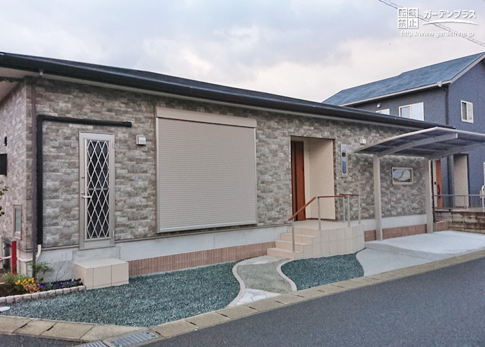 できるだけ道路との高低差を無くすため、建物基礎沿い部分に接する床の高さを少し掘り下げ、裾隠しとして化粧ブロックの1段施工でカバーしています。10cm程度の段差解消が出来ました!