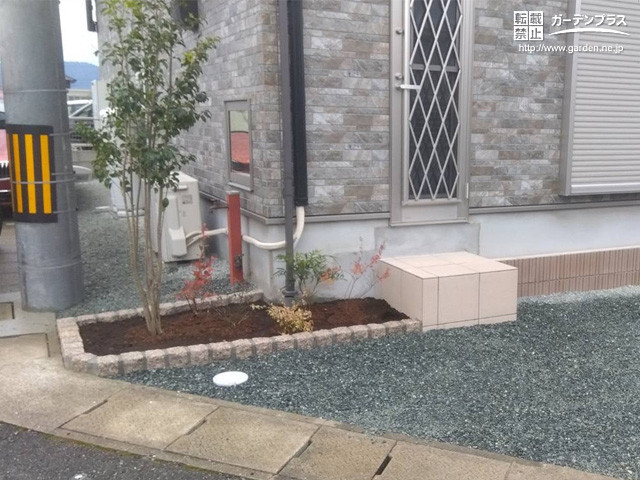また、勝手口のステップの横に、お手入れのしやすいサイズの植栽スペースを設けました。玄関アプローチと同じサクラ色のピンコロを縁取りして、ソヨゴと低木類を植栽しています。