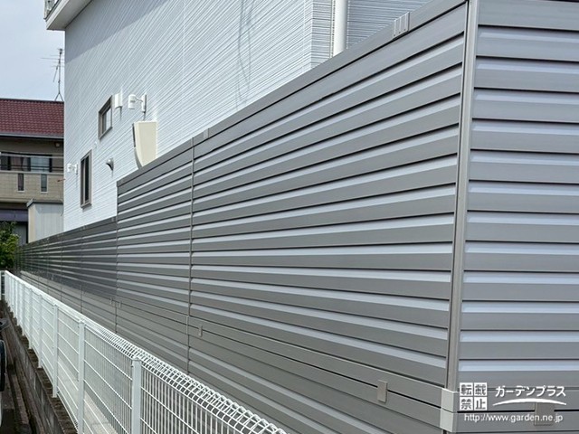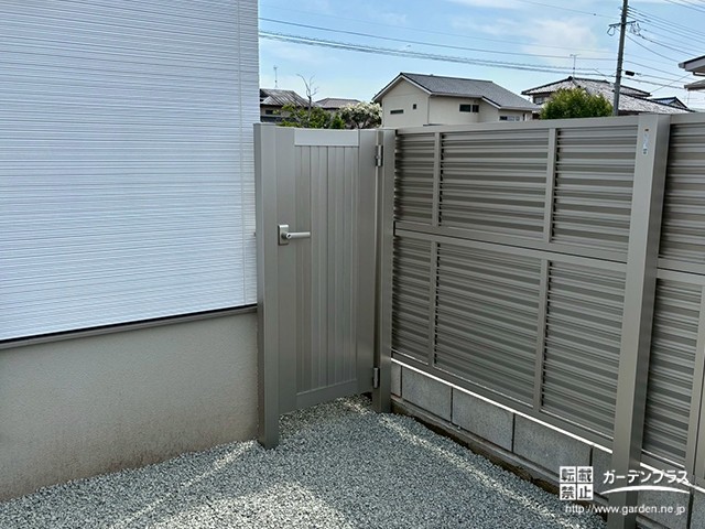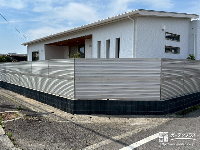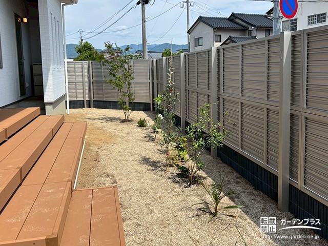 またプライベート空間を重視するために南側庭を中心にクローズ外構の設計を行いました。建物正面入り口周囲は、門柱の配置から連続してアルミ製自立柱に多段形式のフェンス本体を取り付ける目隠しフェンスには、「ミエーネフェンス」を採用しています。