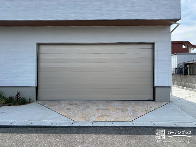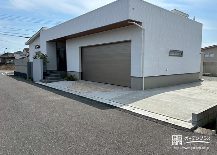 建物設計段階から外構の打ち合わせをさせていただきましたので、シャッターゲートの納まり部分のコンクリートも当店で施工しました。天然石の厚みを計算して下地コンクリートを事前に打設しています。周囲は段差が出来ないように、エキスパンダイの目地を活用してフラットに仕上げています。エキスパンダイ目地は、コンクリートの割れ防止として一定区画ごとに配置しますが、今回は自然石周囲とその他外部駐車場に斜めに配置して意匠性を含めてデザインしています。乱張りのデザインと連動させるような仕上がりです。
