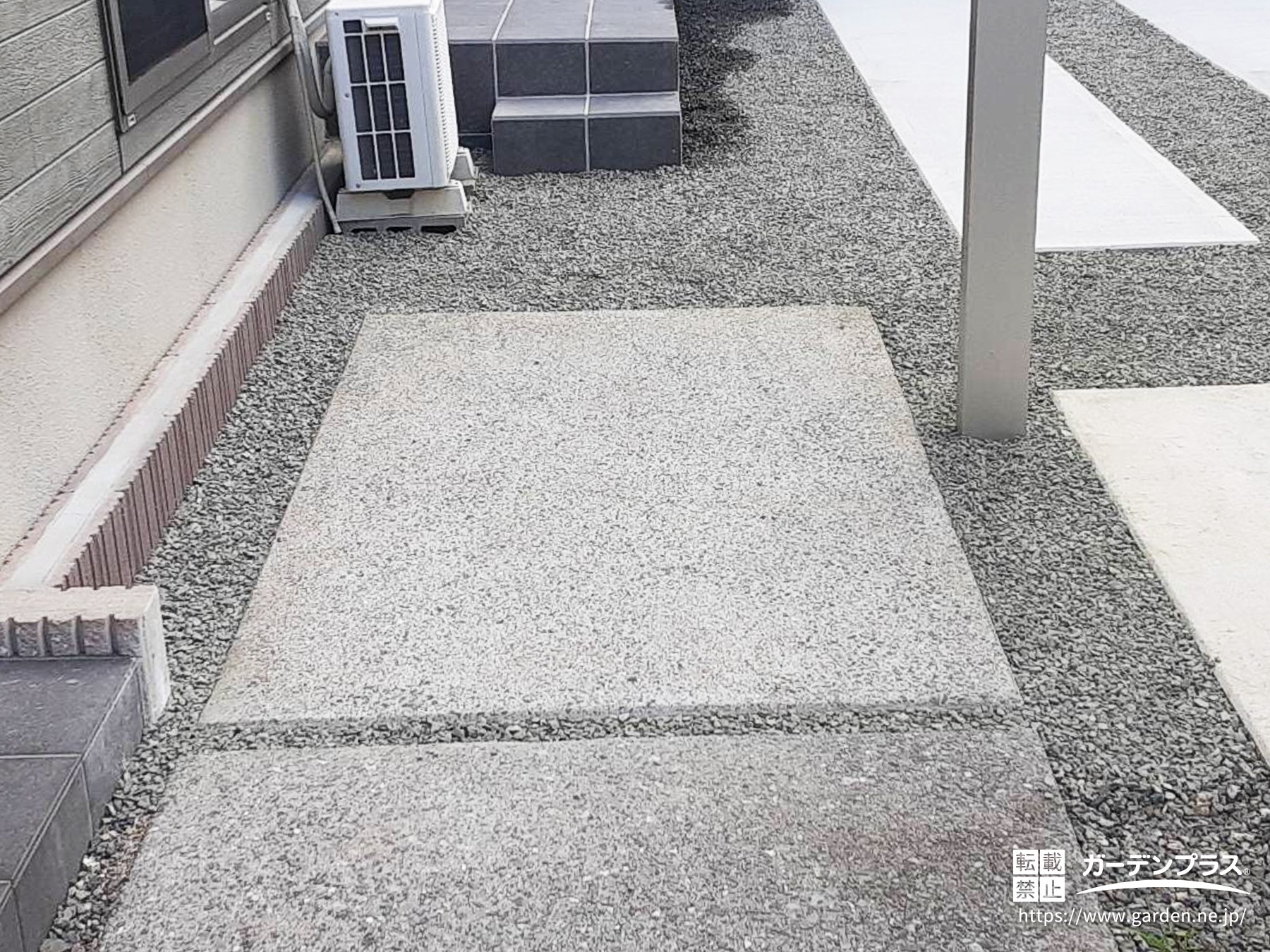 玄関アプローチからタイルデッキまでの間は、土留めを撤去した後、子供さんの自転車を止めることが出来るようにコンクリートを打設。アクセントとしてコンクリート表層の洗い出し仕上げも行いました。