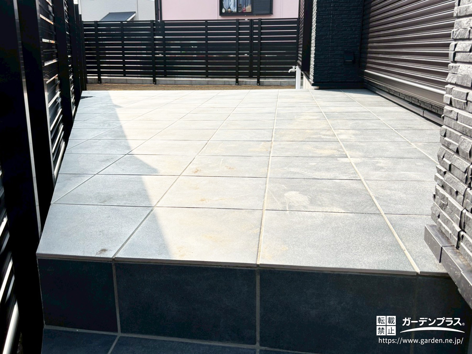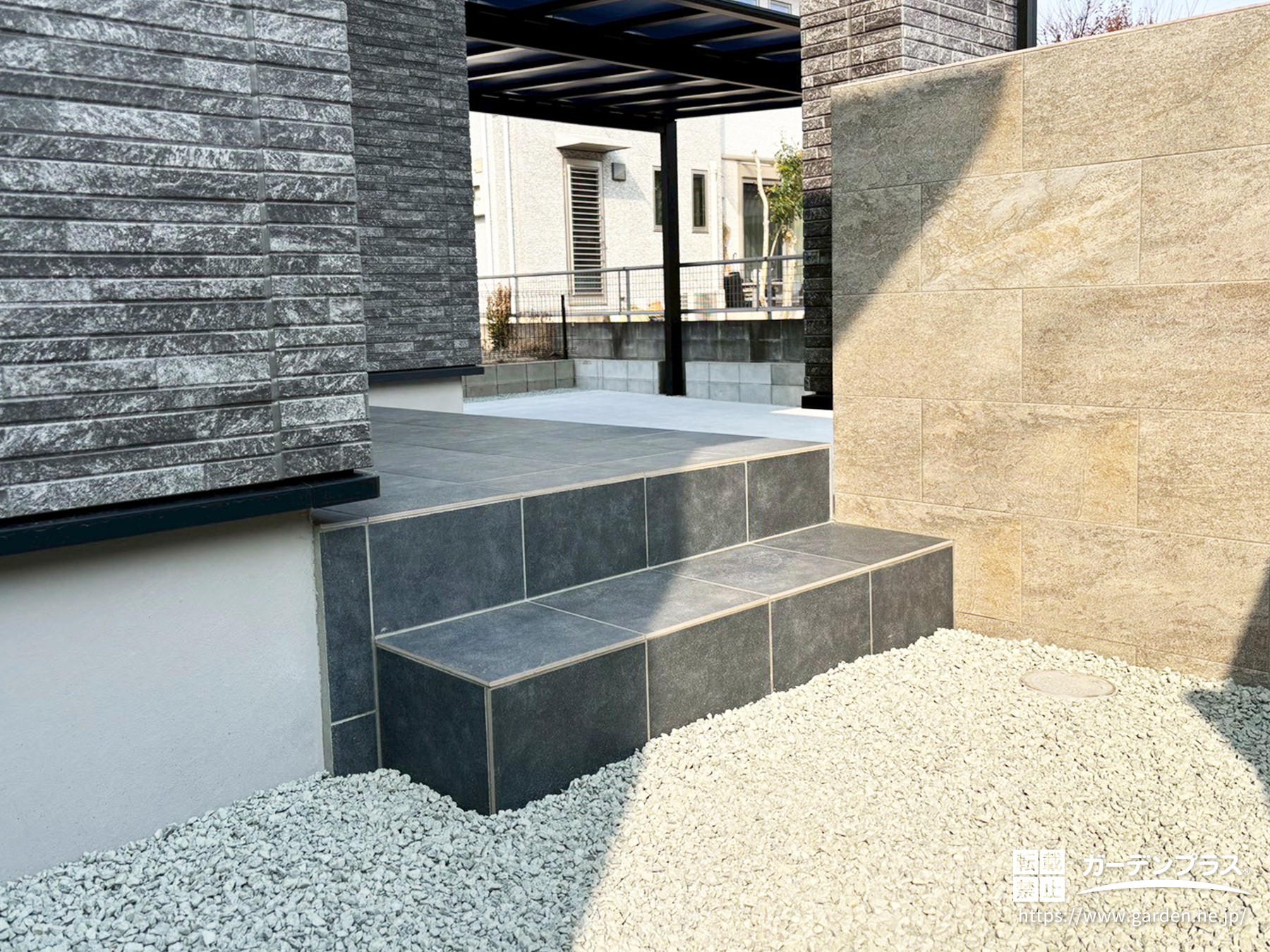 更に玄関ポーチの階段を登り切り、左側から門柱の裏側を通り、庭へアクセス出来るようにステップを追加造作しました。タイルの商品や目地を合わせて施工することで、後付け感の無い仕上がりとなっています。
