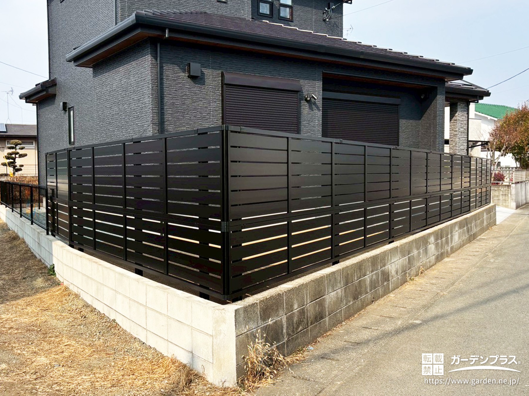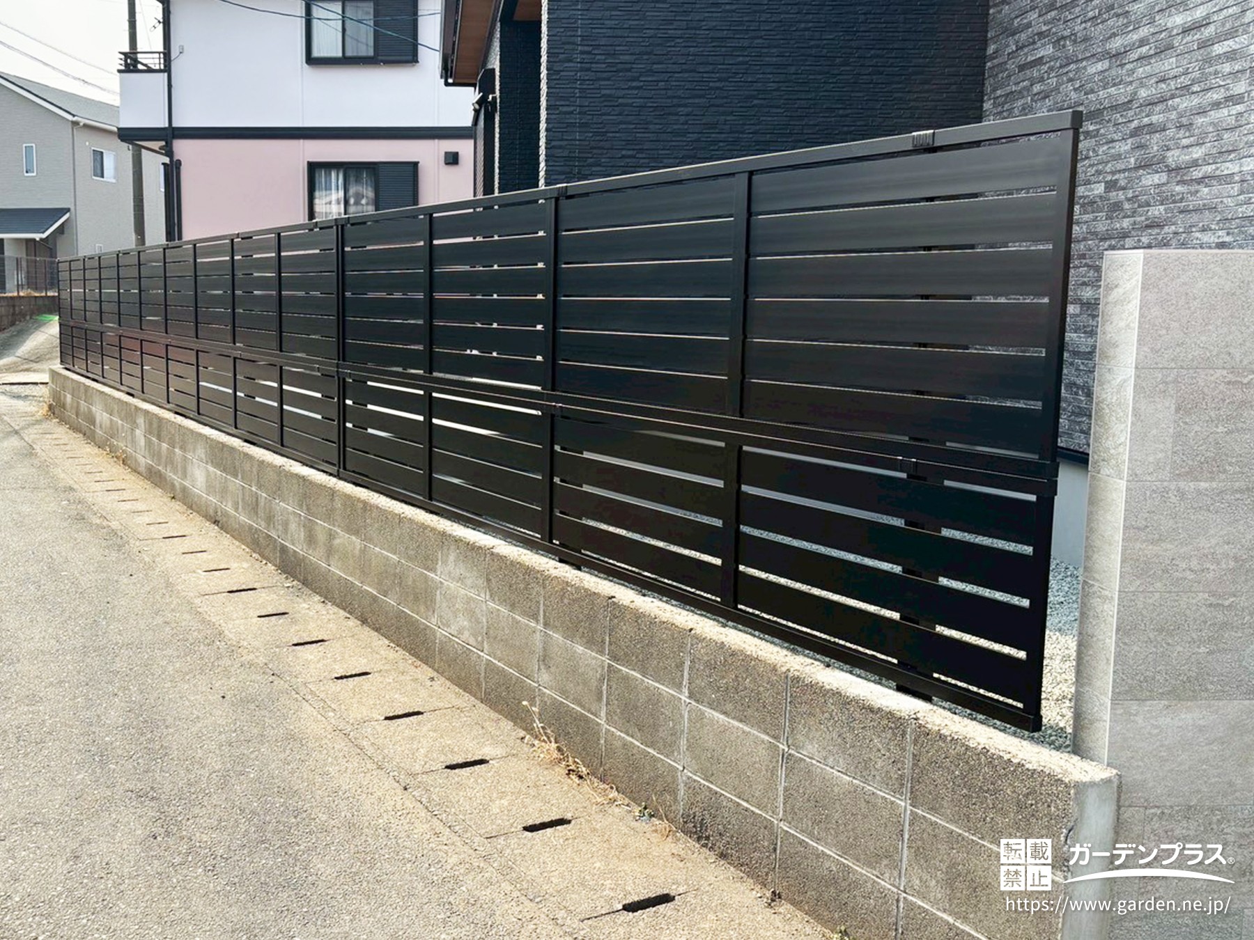 採用したのは、リクシルの「フェンスAB YS3型」の黒色です。高さ80cmと60cmの2段を組み合わせ、多段柱によって道路からの高さを約1.8mに設定しました。これにより、通行人の視線を十分に遮る高さが確保できています。