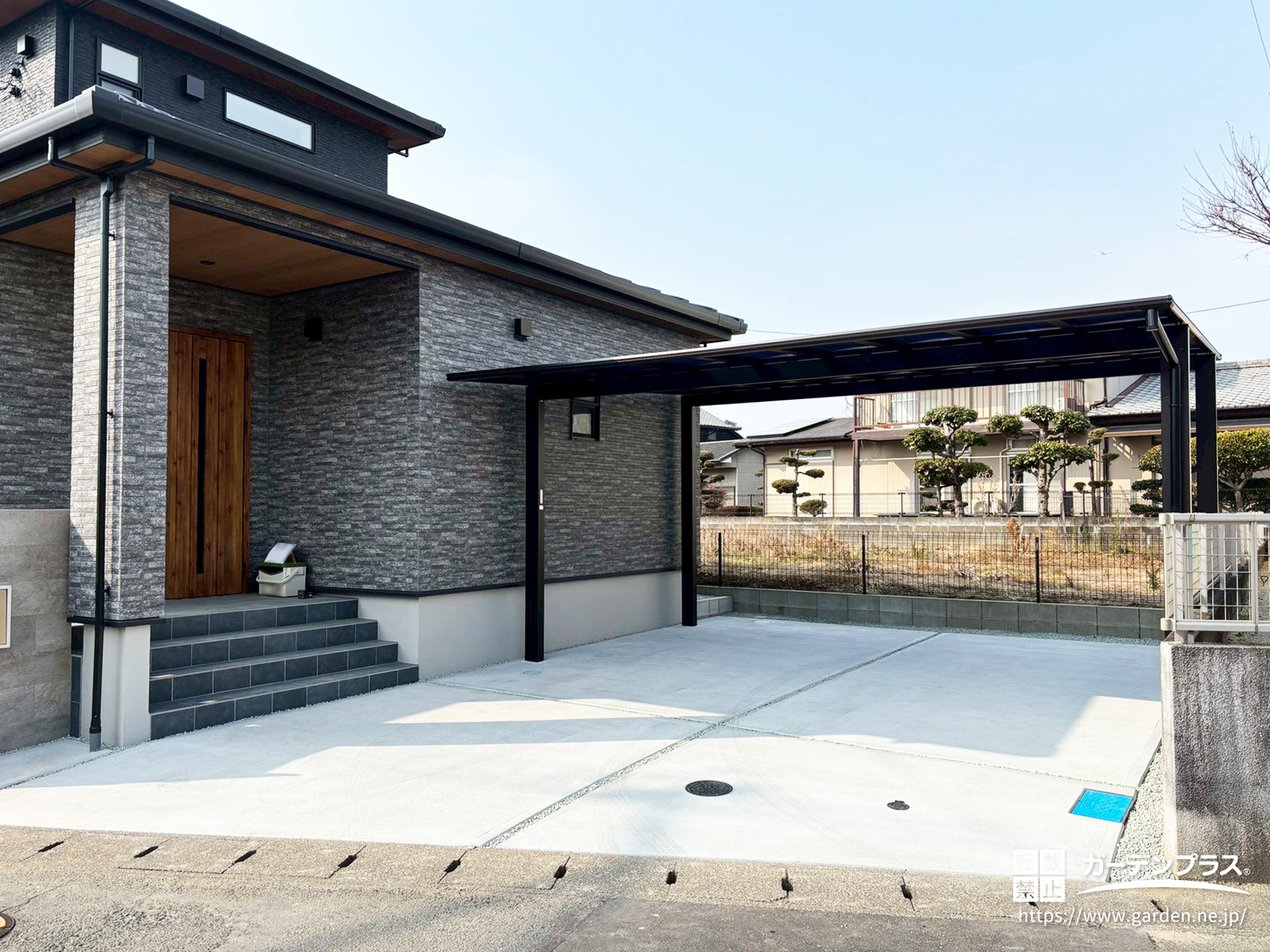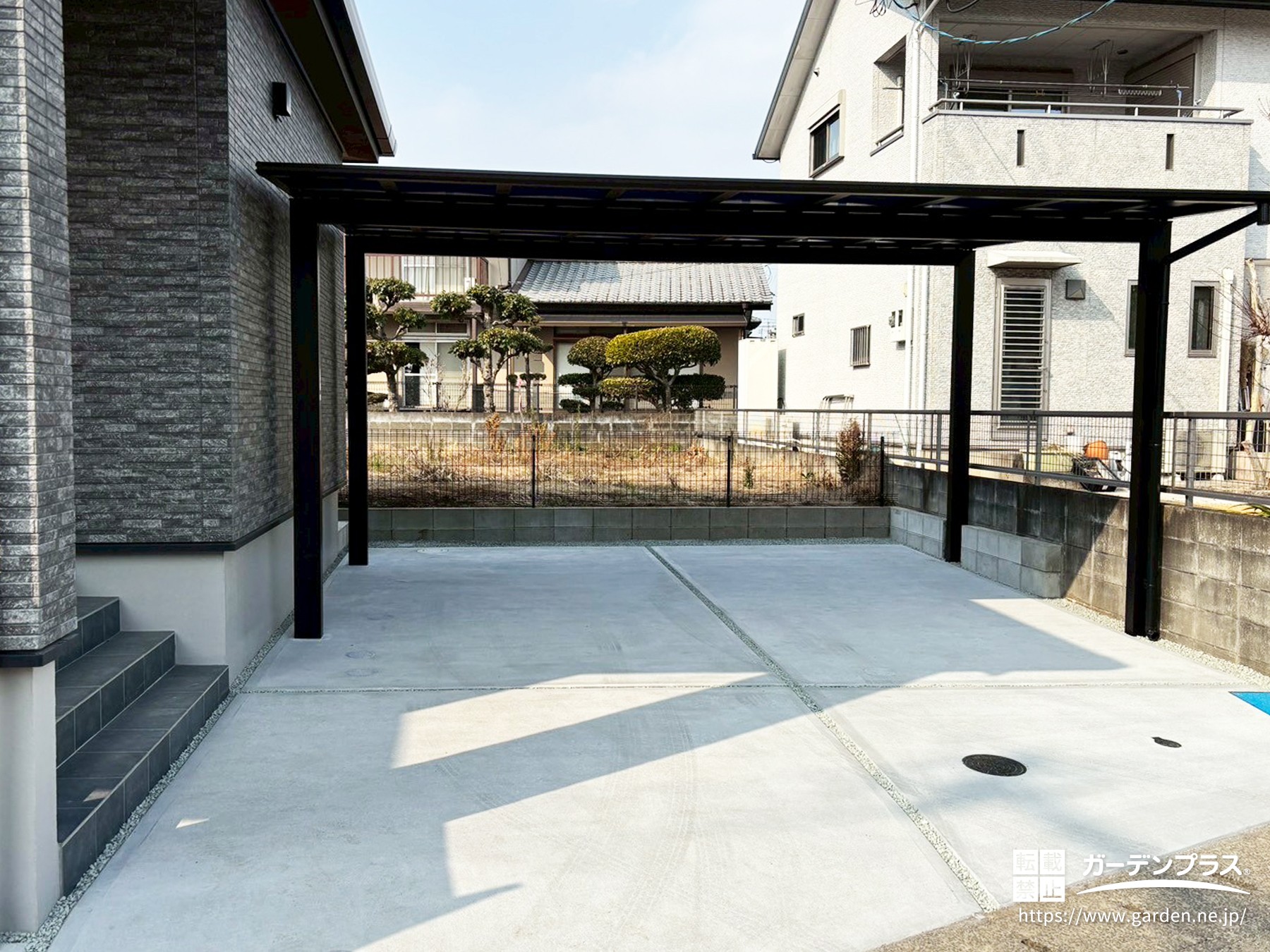 玄関前の駐車場にはコンクリートを打設し、YKKAPの2台用カーポート「エフルージュ FIRST 600タイプ」を設置しました。熱線遮断ポリカーボネートの屋根材を使用したこの商品は、多くのお客様からご支持いただく人気の仕様です。