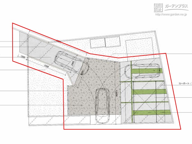 既存の駐車スペースの後方にスロープ(図面左上)を設けて、そこからスムーズに車の出入りができるような駐車スペースを考えさせていただきました。段差を無くしてスロープを設けることで、車の停める台数も増やすことが出来るので一石二鳥ですね!