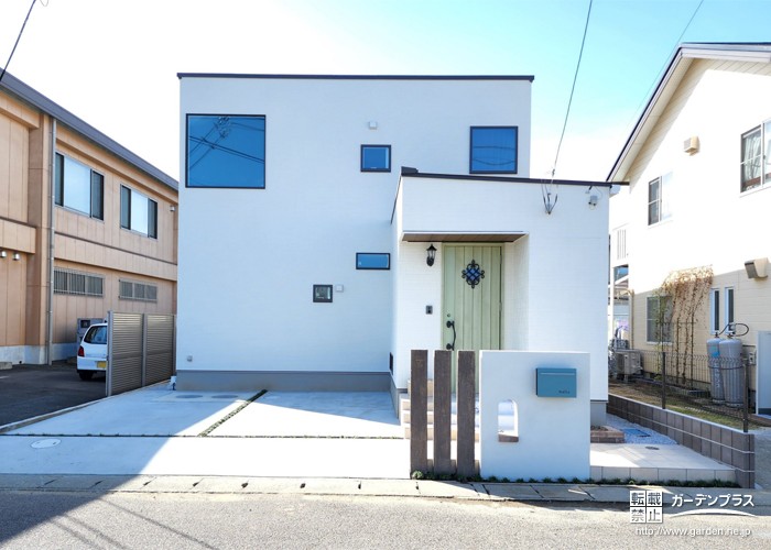 白い壁やミントカラーのドアが爽やかな建物に合わせた外構を作らせていただきました。