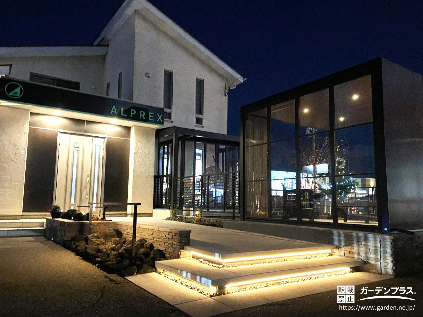 ・室内から眺める、夜のお庭のやさしいライトアップ。