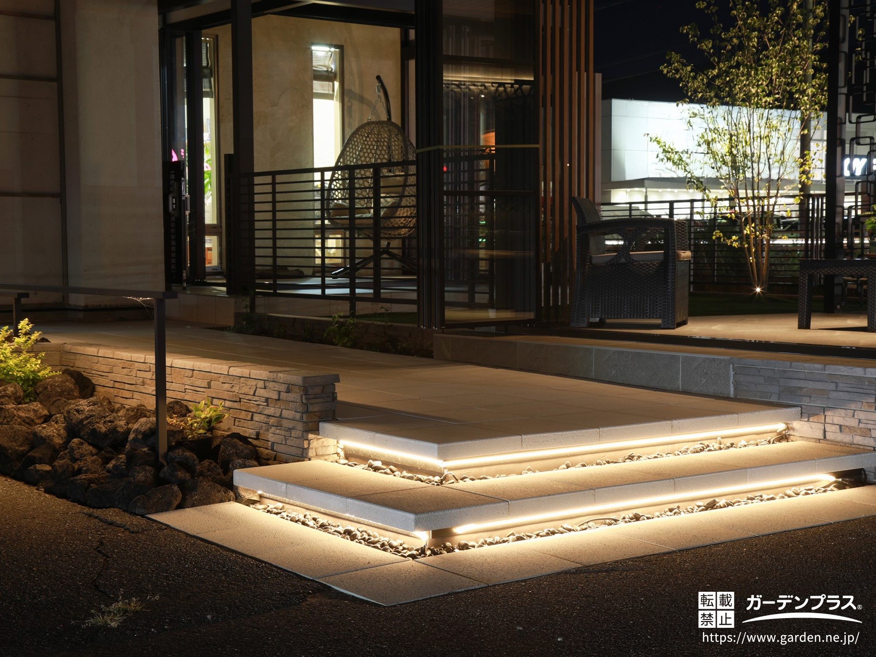 お洒落と安心を同時につくれるのがラインライトの大きな魅力です。近年人気の浮き階段に仕込んだり、手すりの裏側に設置したりすると、光が主張しすぎず、ぐっと洗練された外構に仕上がりますよ。