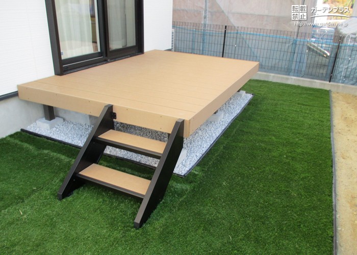 そこで、ウッドデッキを設置させていただくことにより、お子さまは安全に掃き出し窓から外へ、ステップを使って人工芝のお庭へとスムーズな動線ができあがります。