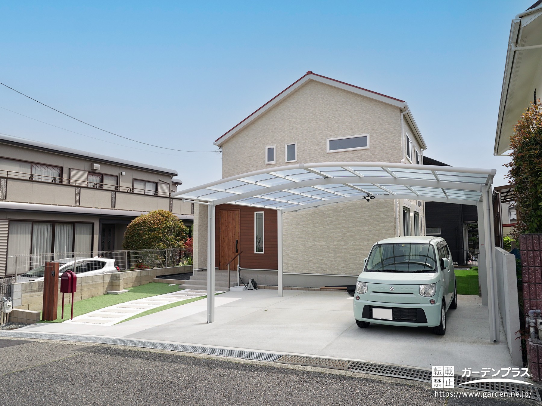 オープン外構は、敷地の周囲に塀や門扉を設けず、道路や周囲の景観と視線が自然につながる開放的な外構スタイルです。敷地と道路の境界を大きく遮らないため、玄関やアプローチ、駐車スペースなどが外から見える構成になるのが特徴です。建物と街並みがゆるやかにつながるデザインになりやすく、植栽やアプローチを取り入れながら軽やかな印象の外構をつくることができます。道路から玄関までの動線が分かりやすく、敷地全体をすっきりと見せやすい外構スタイルです。