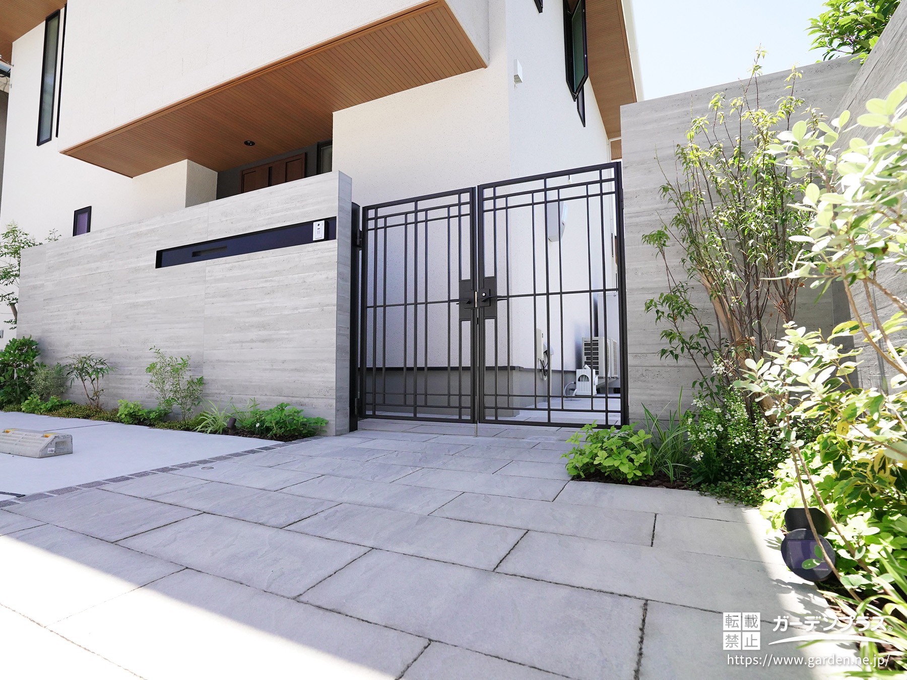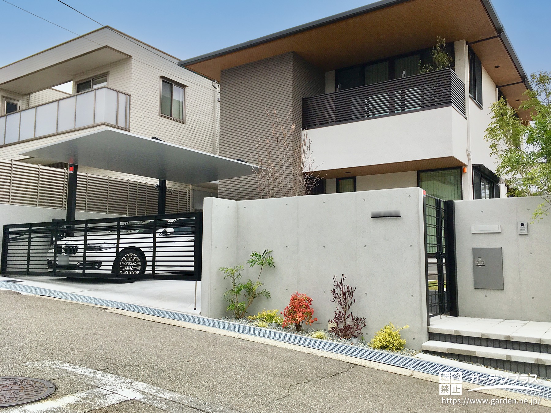 一方、クローズ外構は、塀や門扉、フェンスなどを設けて敷地の周囲を囲い、外との境界を明確にする外構スタイルです。門扉を通って玄関へ向かう構成になるため、敷地内と道路の空間をはっきり分けたレイアウトになります。門まわりや塀、フェンスなどのエクステリアを組み合わせながら外構全体をデザインすることが多く、建物と調和した門まわりの空間をつくりやすいのが特徴です。敷地を囲うことで、お庭やアプローチをひとつのまとまった空間として計画できる外構スタイルです。