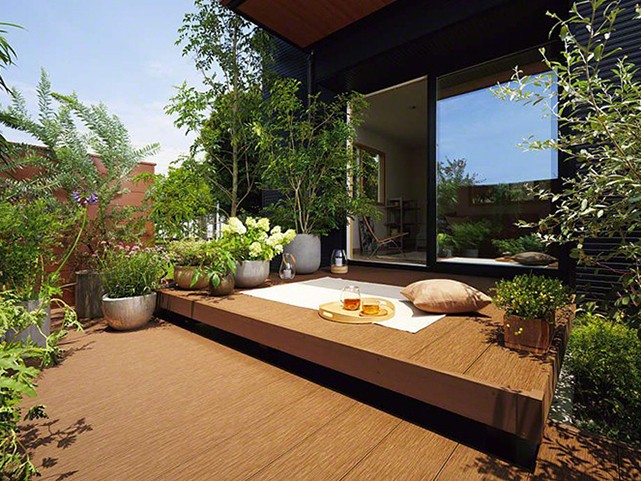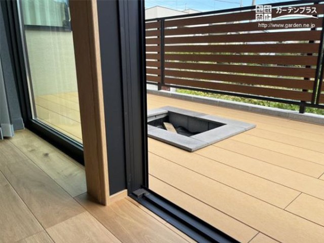 木のぬくもりを感じられる人気のウッドデッキ。フローリングが広がったようなデザインで、リビングとの段差をなくすことで、室内から自然につながる開放感が生まれます。