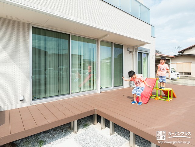 さらに、塀やフェンスを組み合わせれば、外からの視線を気にせず過ごせるプライベート空間に。身支度を整える必要もなく、室内の延長線で屋外で外遊びできるのでお庭へ出るハードルも下がります。子どもやペットのストレス発散にもぴったりです。